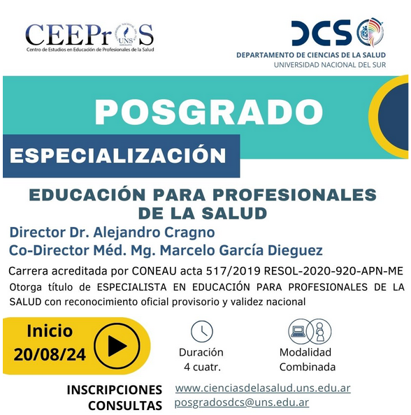 Más información sobre la Especialización en Educación para Profesionales de la Salud en la página web de Educación a Distancia de la Universidad Nacional del Sur haciendo clic aquí.